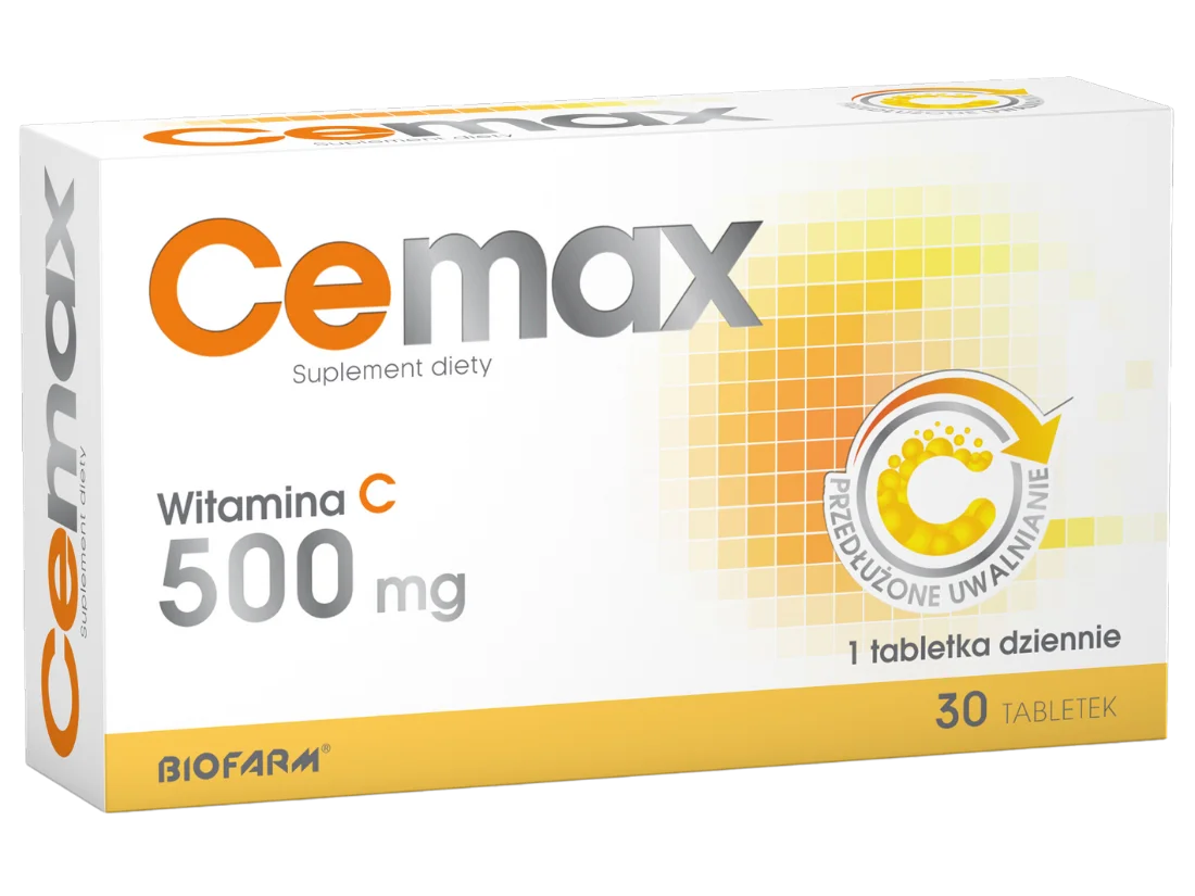 Cemax to suplement diety bogaty w składniki aktywne, która pomagają uzupełnić codzienne żywienie i wspomóc odporność organizmu. Produkt występuje w postaci tabletek o przedłużonym uwalnianiu zawierających 500 g witaminy C (kwas L-askorbinowy), która: