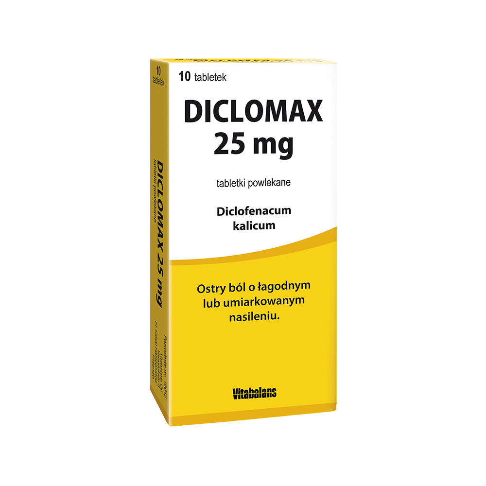 Diclomax 25 mg to lek z diklofenakiem bez recepty. Preparat ten zalecany jest pacjentom dorosłym zmagającym się z ostrym bólem. Diclomax skutecznie łagodzi ból o łagodnym lub umiarkowanym nasileniu. Tabletki z diklofenakiem działają nie tylko przeciwbólowo, ale również przeciwzapalnie i przeciwgorączkowo. Substancja ta zmniejsza dolegliwości reumatyczne, takie jak ból stawów czy też poranna sztywność stawów.