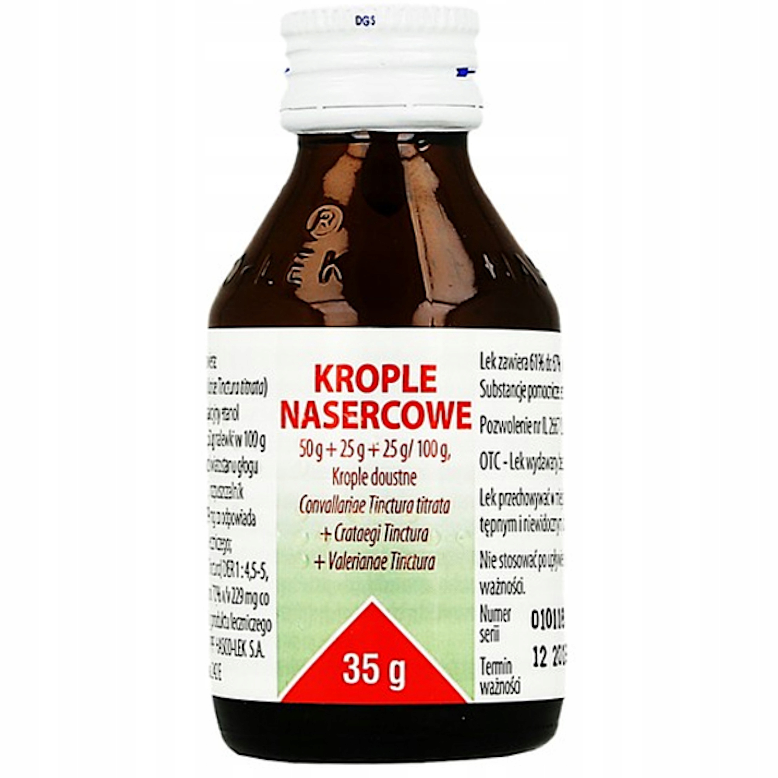Krople nasercowe zawierają wyciąg z konwalii ,głogu, waleriany. Ziele konwalii majowej powoduje zwiększenie siły skurczu mięśnia sercowego z jednoczesnym zmniejszeniem jego częstotliwości. Kwiatostan głogu działa spazmolitycznie na naczynia wieńcowe, zwiększając ukrwienie serca. Powoduje niewielki spadek ciśnienia krwi, działa uspokajająco. Korzeń kozłka lekarskiego zmniejsza napięcie mięśni gładkich naczyń krwionośnych.