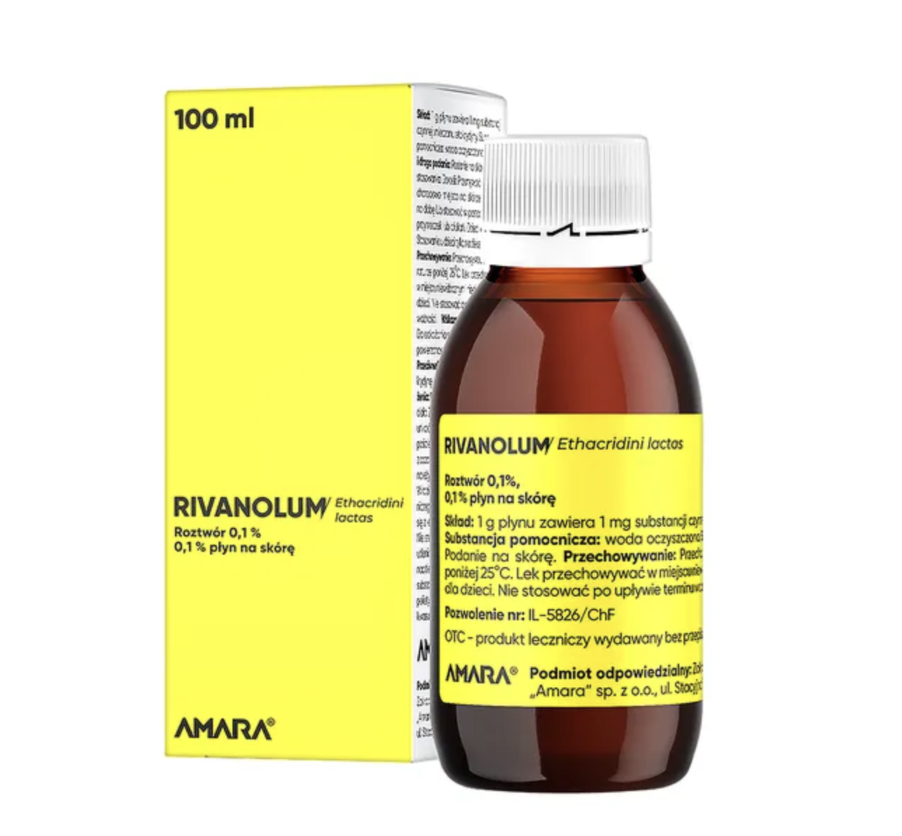 Rivanolum to produkt leczniczy o wyglądzie żółtego płynu do stosowania na skórę w celach odkażających (w tym również uszkodzeń skóry).